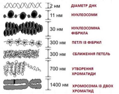Нуклеосома– структурна частина хроматину, утворена ділянкою нитки ДНК намотаною на серцевину із основних білків-гістонів, має діаметр ~11 нм.