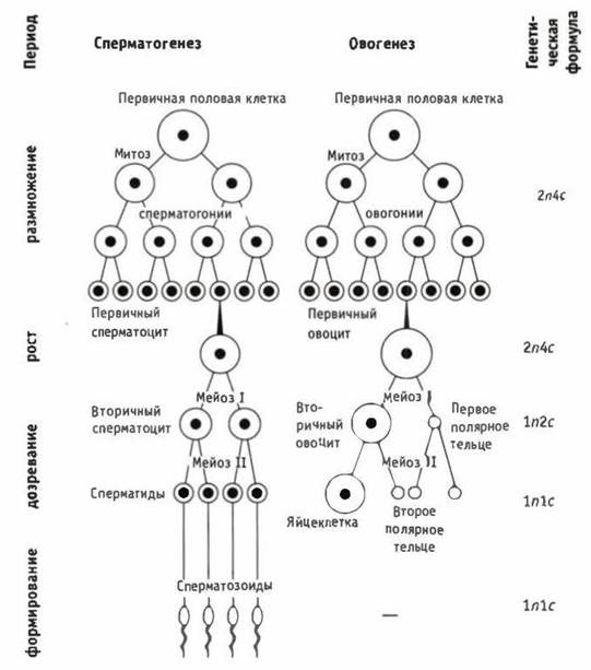 - Третій період – період дозрівання. У цей період відбуваються два мейотичні поділи. При першому мейотичному поділі (редукційному) овоцит першого порядку ділиться на дві нерівні за розмірами клітини – великий овоцит другого порядку, який містить жовток і майже всю цитоплазму, і маленький полоцит (перше редукційне, або напрямне, полярне тільце), який містить майже тільки ядро. Обидві ці клітини – гаплоїдні (1n2с – 23хромосоми). При другому мейотичному поділі (екваційному) овоцит другого порядку ділиться на дві і теж нерівні клітини: велику яйцеклітину (1n1с – 23хромосоми), яка містить увесь жовток і цитоплазму, і маленький другий полоцит (1n1с – 23хромосоми). Перший полоцит теж може ділитися, утворюючи два полоцити з гаплоїдним набором хромосом у кожному. Таким чином, з однієї вихідної диплоїдної клітини (овогонія) в результаті овогенезу утворюються чотири гаплоїдні клітини: одна велика яйцеклітина і три маленькі полоцити, які дегенерують. Поділ овоцитів на нерівні за розміром клітини має біологічне значення: у такий спосіб яйцеклітина одержує не лише гаплоїдний набір хромосом, а і весь жовток і цитоплазму, а разом з цитоплазмою і цитоплазматичну спадковість. На відміну від сперматогенезу, який починається в чоловіків з настанням статевої зрілості, овогенез у жінки починається в ембріональних яєчниках ще до її народження. Під час внутрішньоутробного розвитку овогонії розмножуються мітозом, ростуть і перетворюються в овоцити першого порядку (приблизно 7 млн. клітин). Овоцит першого порядку вступає у перший мейотичний поділ, але не завершує його. Мейоз зупиняється на стадії диплонеми профази І. Овоцити першого порядку не вступають у діакінез, а переходять у стадію диктіотени, яка властива лише овогенезу і не властива сперматогенезу. На цій стадії мейоз переривається на багато років – від 12-15 до 45-50 років. Вважають, що саме це є причиною порушень нормального розходження хромосом при мейозі і підвищення частоти народження в матерів старшого віку дітей з хромосомними хворобами. На момент народження в яєчниках жінки міститься близько 2×106 фолікулів, в яких овоцити першого порядку знаходяться на стадії диктіотени. З настанням статевої зрілості під впливом лютеїнізуючого гормону гіпофізу один з фолікулів кожного місяця дозріває. Під час дозрівання овоцит першого порядку виходить зі стадії диктіотени, вступає в діакінез профази І і завершує перерваний мейоз, утворюючи овоцит другого порядку і перший полоцит. На момент овуляції (розрив стінки фолікула та стінки яєчника і вихід овоцита в черевну порожнину), овоцит другого порядку знаходиться на стадії метафази II, але не продовжує її, поки не з’єднається у матковій трубі з сперматозоїдом. При заплідненні овоцит другого порядку завершує другий мейотичний поділ, утворюючи зрілу яйцеклітину і другий полоцит. За весь репродуктивний період жінки дозріває близько 450 фолікулів, інші дегенерують.